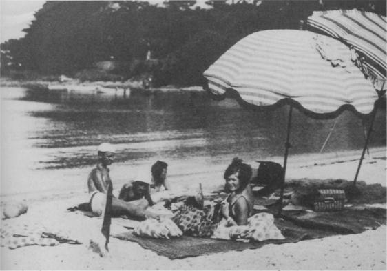 The beach at La Garoupe raked by Gerald Murphy, seen here under umbrellas with his wife Sara and Etienne and Edith de Beaumont, c. 1924. Zelda and Scott visited regularly from their villa at Juan-les-Pins